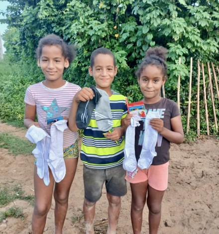 Yaima (left) sharing the good news. Some of the children who received school supplies